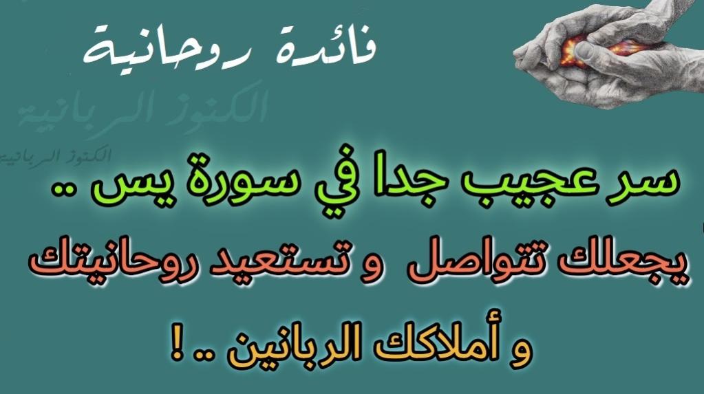 78-79 من سورة يس و هي .. قَالَ مَنْ يُحْيِي الْعِظَامَ وَهِيَ رَمِيمٌ قُلْ يُحْيِيهَا الَّذِي أَنشَأَهَا أَوَّلَ مَرَّةٍ وَهُوَ بِكُلِّ خَلْقٍ عَلِيم هاتين الايتين المباركتين اقرأهما عدد 111 مرة ما بين صلاتي الشفع و الوثر و قم بالفائدة في اول الشهر العربي اقصد من اول الشهر العربي الى 13 منه أي يوم كان و تداوم عليها سبعة ايام متواصلة بنية التواصل او استعادة روحانيك و املاكك الربانين فانك ترى عجبا شديدا و تتغير لديك الاحلام و الرؤيات و منهم من أصبحت يده اليمنى بها حناء و اهم علامة انه اثناء القراءة ستشم رائحة بخور طيب الرائحة فتابع فانهم يقفون عليك في الرؤيا او ما بين اليقضة و النوم و يتجدد عهدك معهم و ترى ما يسرك و يشرح خاطرك فافهم ما اقصد و الله تعالى المستعان و السلام عليكم و رحمة الله و بركاته