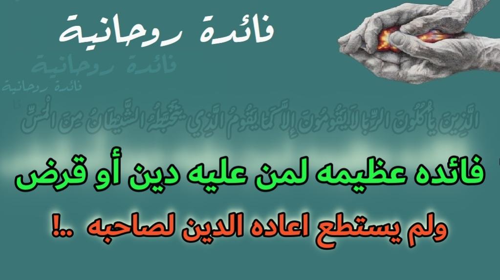 السلام عليكم و رحمة الله و بركاته فائدة اليوم عظيمة و هي دخيرة ربانية لمن عليه دين او قرض و لم يستطع اعادته لصاحبه او للمؤسسة التي اقترض منها و توقفت اموره و دخل في الخسران فتوكل على الله تعالى و انوى تيسيير امرك بهذه الصلاه المباركة بنيه قضاء الحاجه وهى من الصدور وليست من السطور .. و هي بالتجريب و لها برهان قاطع