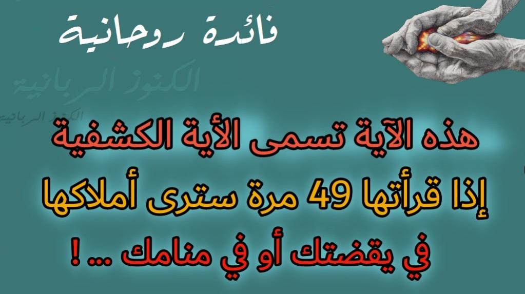السلام عليكم و رحمة الله كنز رباني ترى به أملاك الاية الكشفية يقضون غرضك و حاجتك كائنة ما كانت فان اردت ان تعرف مكان سحر او ضائع او مكان مخفي عليك فاقرأ الاية الكشفية عدد 49 مرة و تنام و انت في بيت لوحدك و يكون لباسك ابيض و تنام على وضوء و القراءة تكون عند دخول الفراش فانك ترى أملاك الاية يقفون عليك في سهو اليقضة و يأخدونك الى المكان و تراه بعينك و تعرفه و ان أدت استخبارهم عن كنز او دفين فخد تراب من مكان هذا الكنز او الدفين و صره في توب ابيض و نام على طهارة و لباسك ابيض في فراش لوحدك فان دخلت فراشك فاقرأ الاية المباركة 49 مرة و تنام فانك تراهم و يأخدونك الى المكان و يعرفوك ما فيه و الاية المباركة تسمى الكشفية الربانية و الاية هي 19 من سورة الانفال .. إِن تَسْتَفْتِحُواْ فَقَدْ جَاءَكُمُ الْفَتْحُ وَإِن تَنتَهُواْ فَهُوَ خَيْرٌ لَّكُمْ وَإِن تَعُودُواْ نَعُدْ وَلَن تُغْنِيَ عَنكُمْ فِئَتُكُمْ شَيْئًا وَلَوْ كَثُرَتْ وَأَنَّ اللَّهَ مَعَ الْمُؤْمِنِينَ