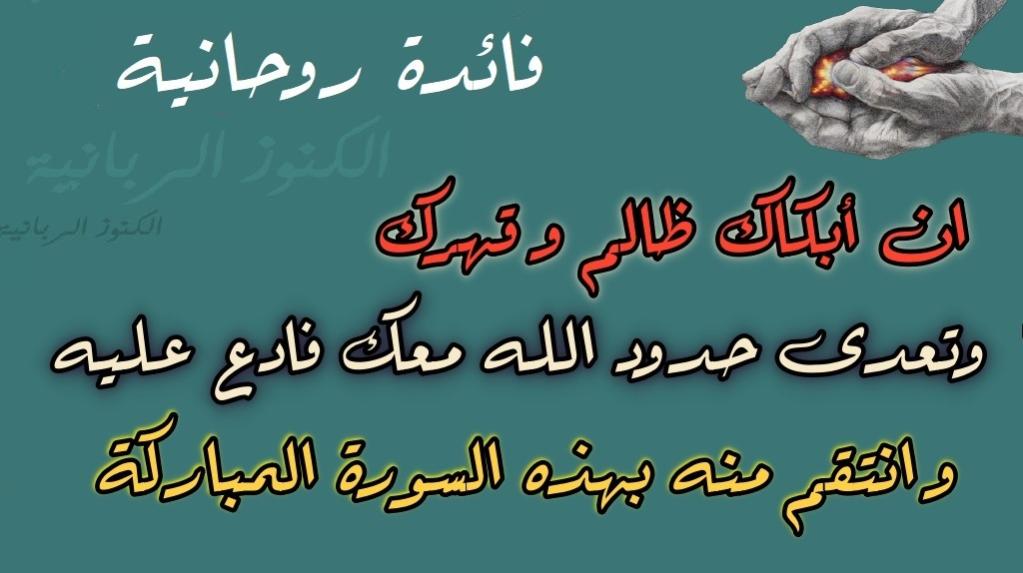 السلام عليكم و رحمة الله و بركاته ان اعتدى عليك ظالم و قهرك و تعدى حدود الله معك فلم يراعي حرمتك و تحدى حتى رب العالمين بظلمه و جبروته فاعلم ان هذا قلبه مظلم و حالته شيطانية و العياذ بالله فخد السورة الدخان قراءة بين صلاتي الشفع و الوثر اي تصلى الشفع و تقوم بقراءة الاية العدد المطلوب ثم تصلي بعد ان تكمل الوثر و اثناء قراءة السورة المباركة ازل أي شيء يغطي رأسك مثل قبعة او غطاء رأس و تقرأ عدد 7 مرات و عند الانتهاء ترفع يديك الى الأعلى و تقول .. سلمت أمري إليك يا ربي ولا يخيب عبد أتاك رافعا يديه اللهم يا منتقم يا جبار قد تجبر علي عبدك من عبيد و استقوى و ظلم اشكوه اليك و لا اسامحه في حقي حتى يوم لقاءك يا حكم يا عدل ارني فيه عجيب قدرتك بحولك و قوتك يا قهار ذو البطش و تكرر هذا الدعاء ثلاث مرات